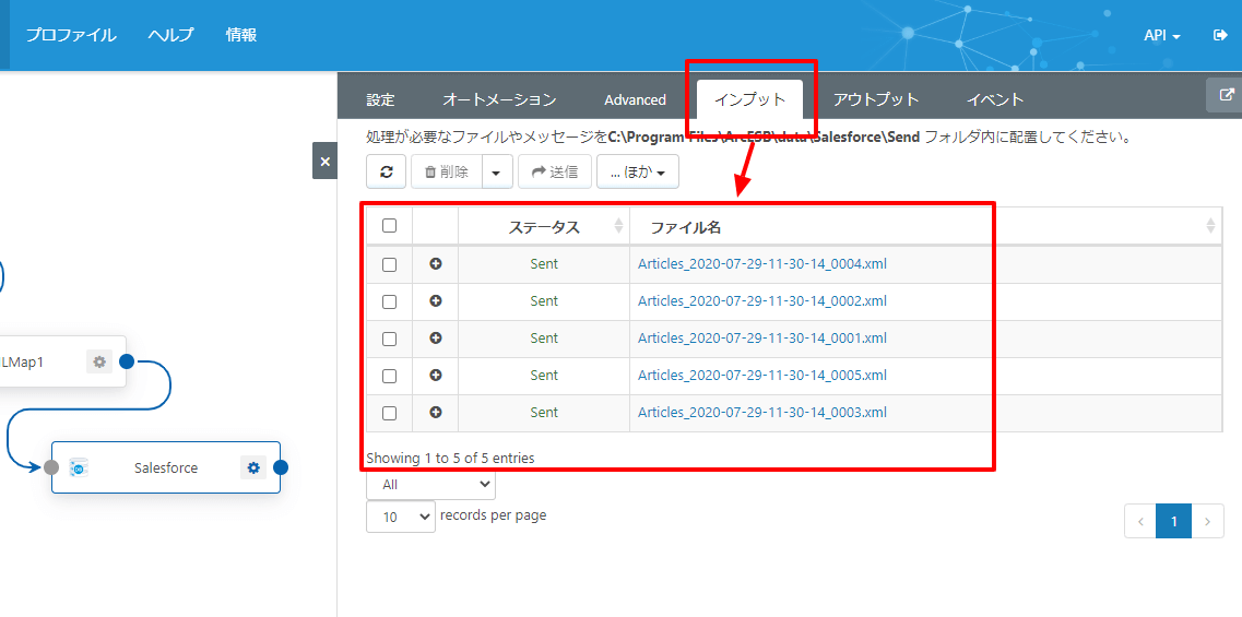 最終的な処理結果は Salesforce Connector のインプットタブから確認できます。ここで処理結果がSentになっていれば、Salesforce側に正常に処理が行われたことになります。