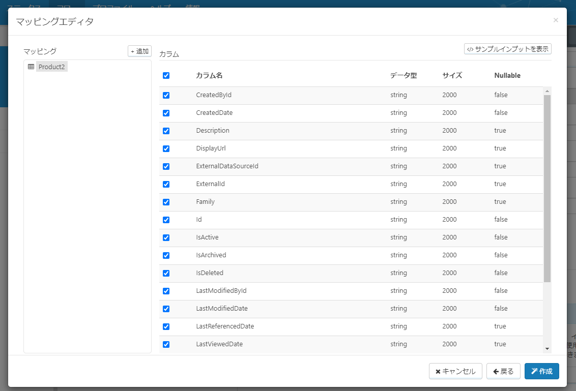 次のマッピングエディタで項目の設定などを行います。今回はデフォルトの設定のまま進めますが、Upsertなどの設定をここで行うことも可能です。
