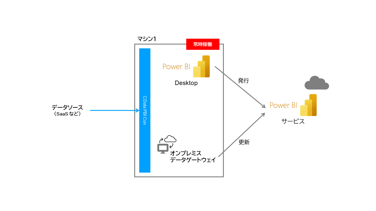 一方、Power BI Desktopがインストールされたマシンは、Power BI Desktop利用時のみ起動していればよく、常時稼働状態にしておく必要はありません。