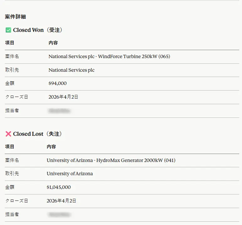 「今四半期のパイプラインを教えて」「失注した案件に共通点はある?」