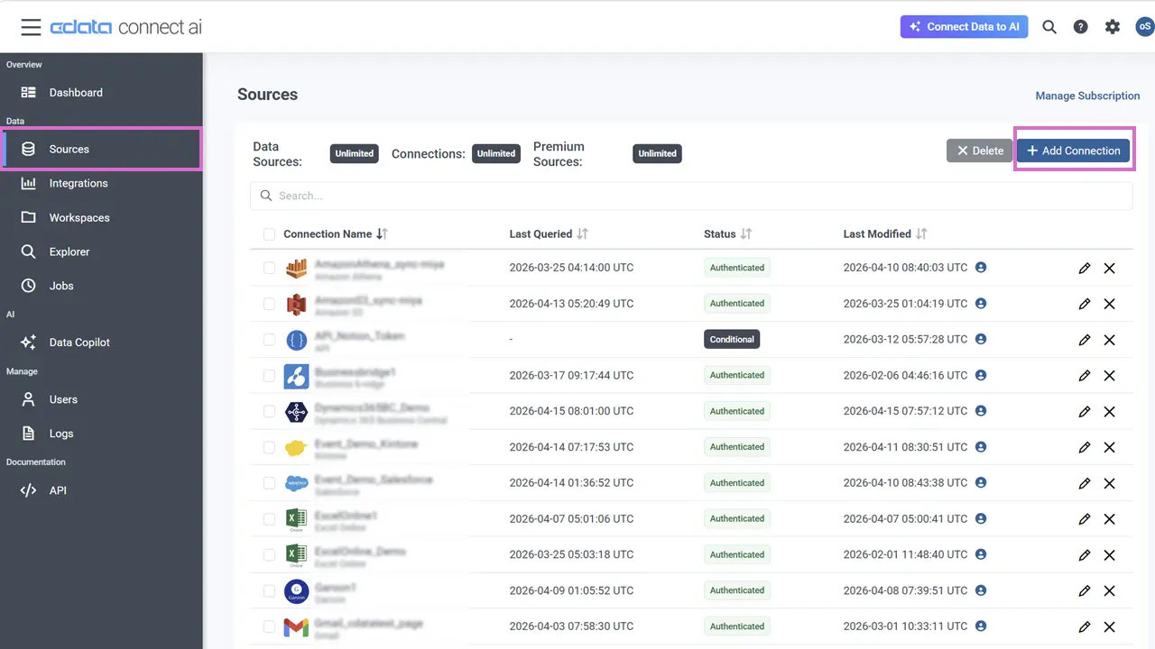 CData Connect AI にログインして「Sources」をクリック、次に「+Add Connection 」をクリック