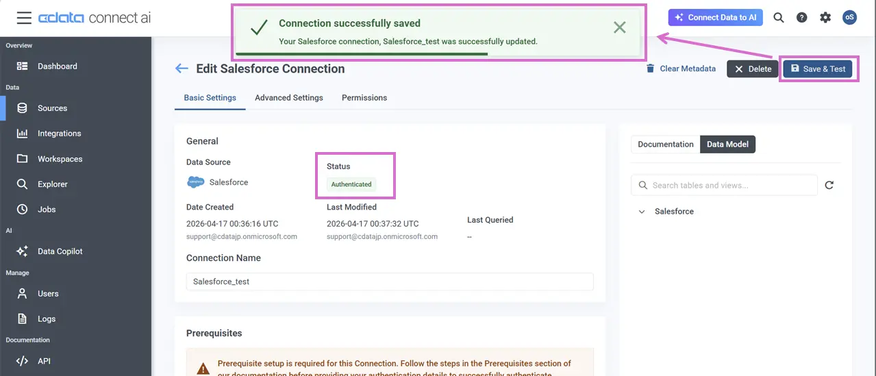 Salesforce アカウントにログインし、CData Connect AI ページ上部右上の「Save & Test」をクリックします。