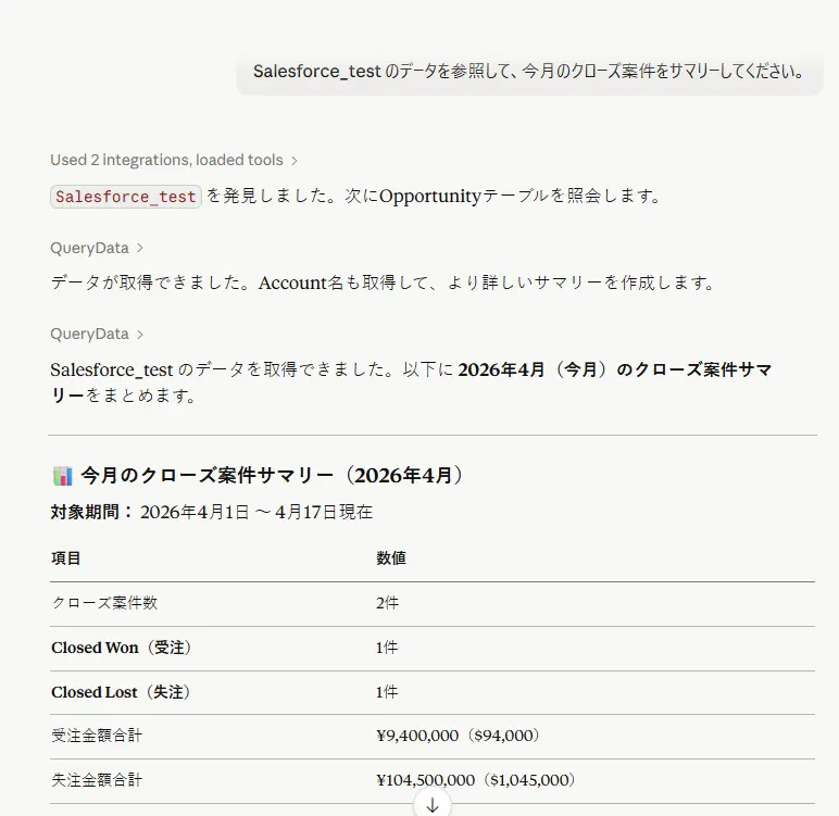 Claude が自動でSalesforce からデータを取りに行き、質問に答えてくれます。