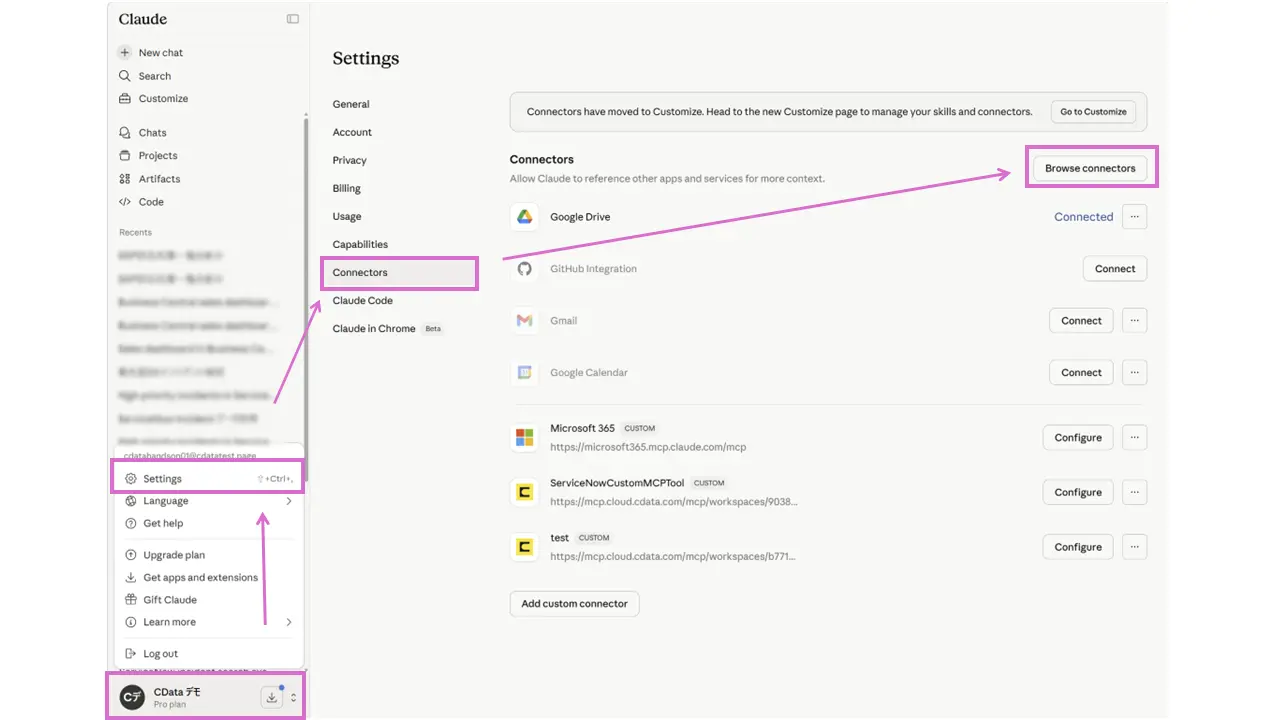 左下のユーザー名 → 「Settings(設定)」 →「Connectors(コネクタ)」 →「Browse connectors(コネクタを参照)」