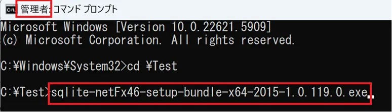 4.「C:\Test」に移動して「sqlite-netFx46-setup-bundle-x64-2015-1.0.119.0.exe」を起動して画面の指示に従ってインストールを完了させます。