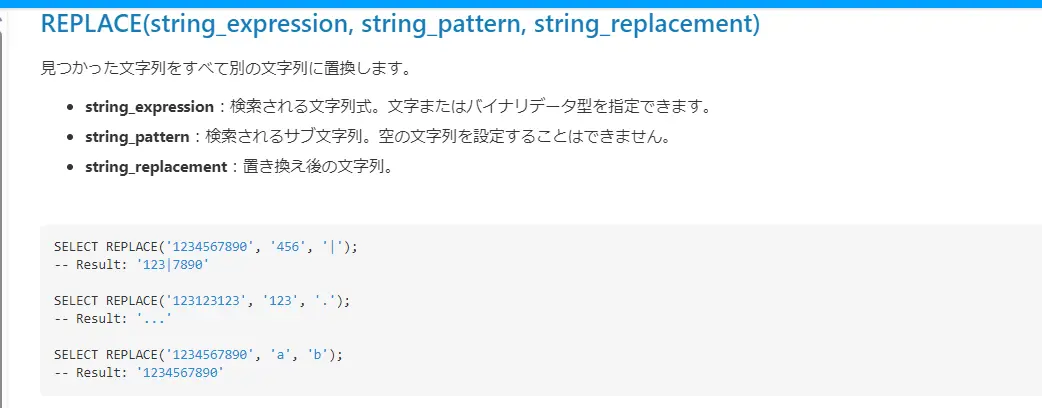 REPLACE 関数のパラメータの説明は、JDBCなどのドライバーのヘルプにて説明しています。