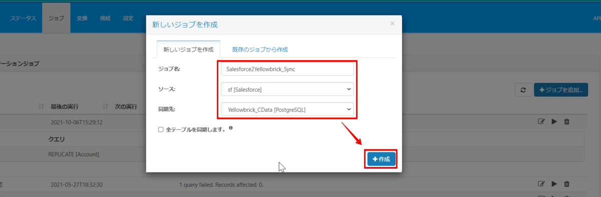 ジョブ作成画面でジョブを追加ボタンをクリックし、ソースに Salesforce の接続情報、同期先に Yellowbrick の接続情報を指定してジョブを作成します。