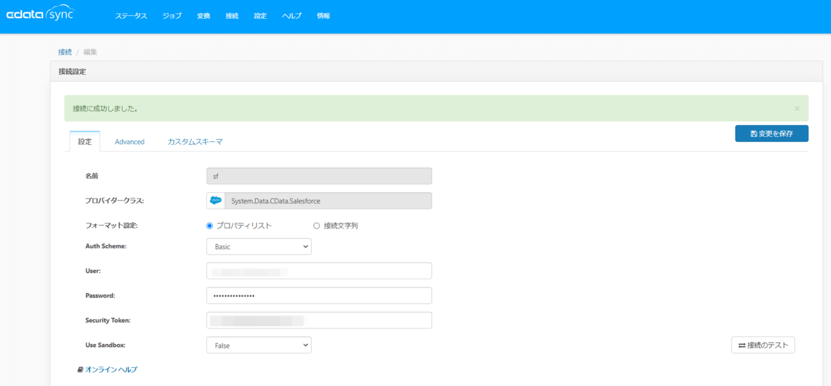 以下の接続情報を入力したら、接続のテスト→保存を行います。