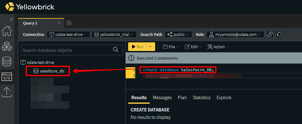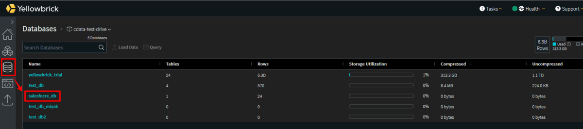 以下は Yellowbrick の管理コンソールです。最終的にはこの Yellowbrick の DB に Salesforce のオブジェクトがそのままテーブルとして追加されるようになります。