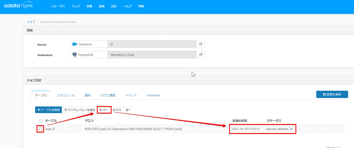 作成したクエリにチェックを入れて実行します。成功するとステータスにレプリケートした件数が表示されるようになります。