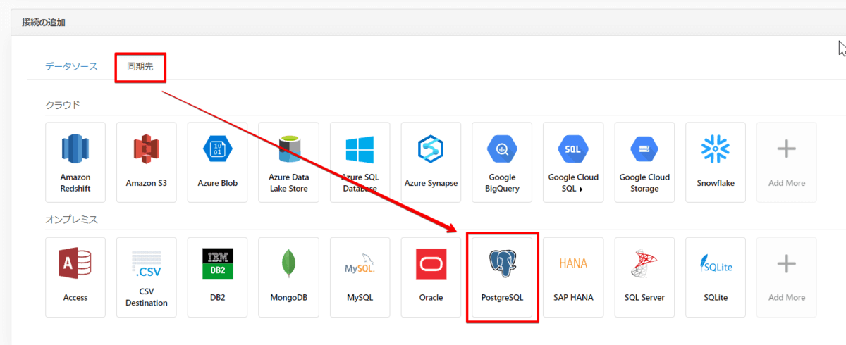 接続情報画面にて同期先→PostgreSQL アイコンをクリックします。