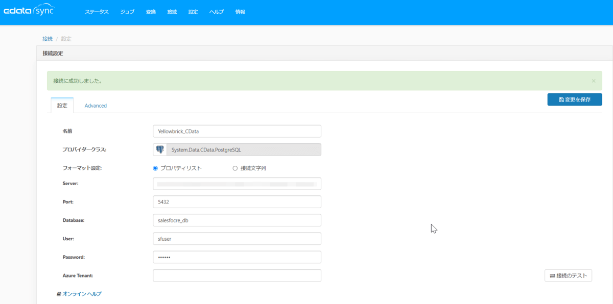 Yellowbrick がネイティブの PostgreSQL Driver で接続できるということから、CData Sync のPostgreSQL コネクタを使って Salesforce のデータを Yellowbrick が保持している DB にレプリケートしてみます。