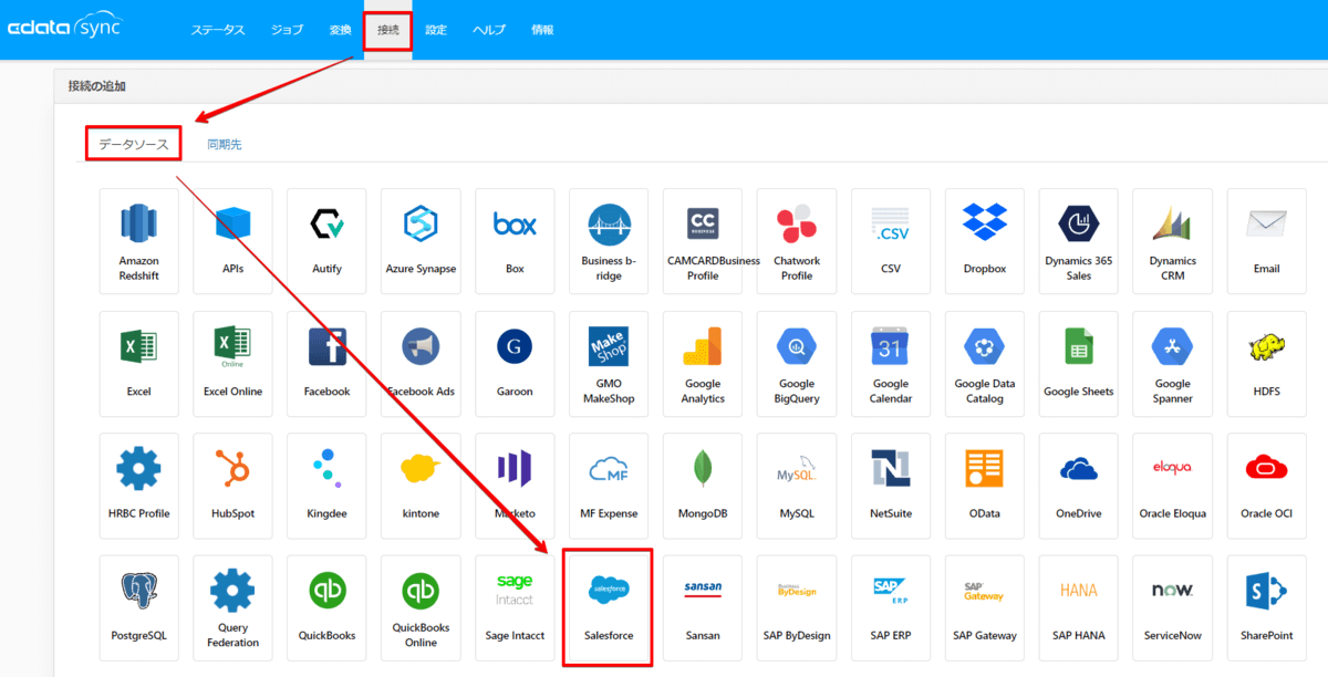 起動しましたら、接続設定を行います。Salesforce アイコンをクリックし、