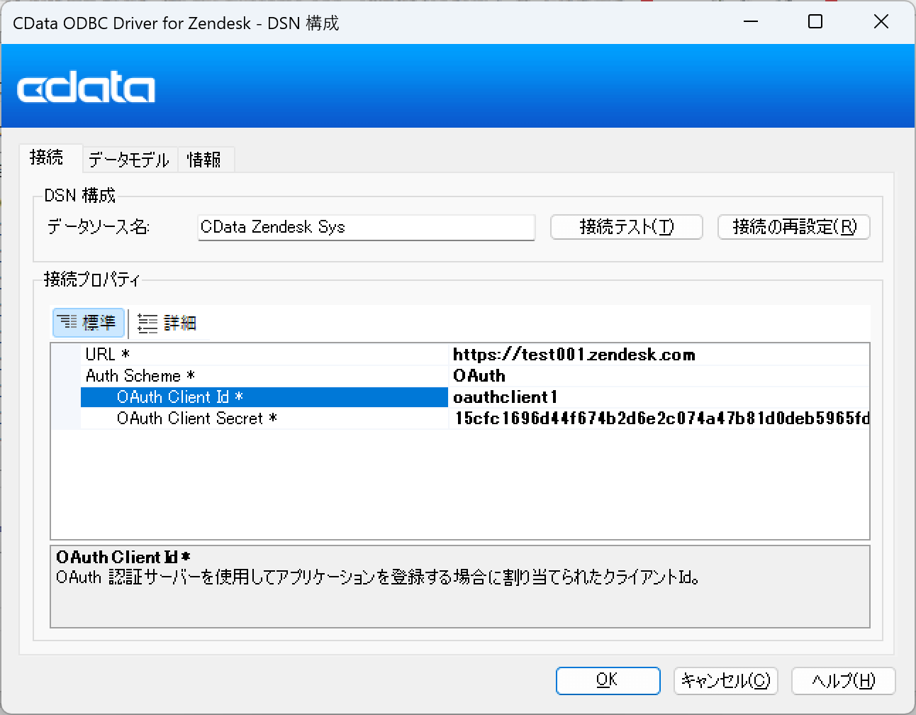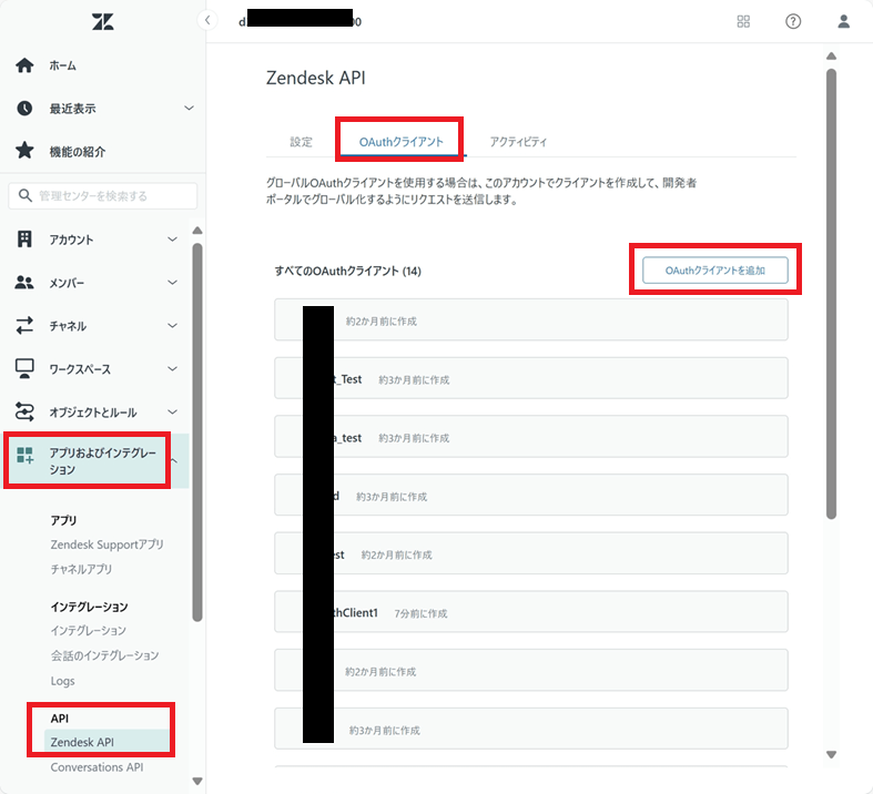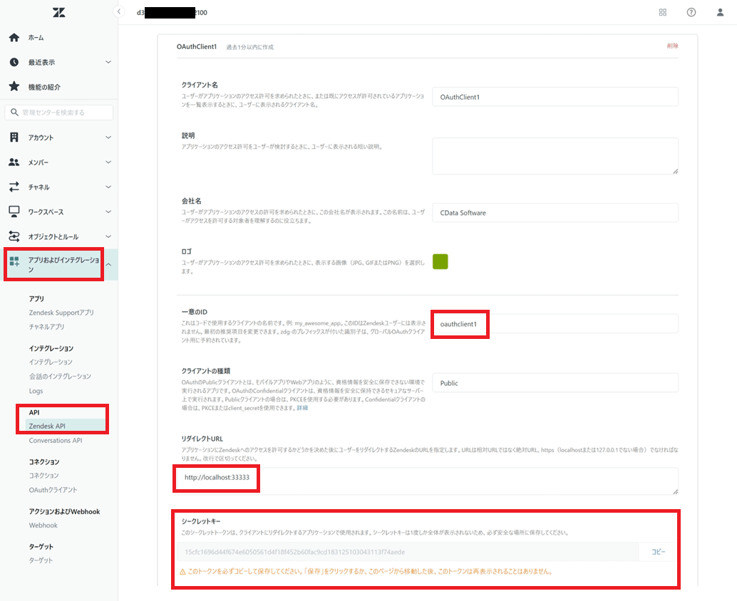 Zendesk は、OAuth 2.0プロトコルを使用した認証方式を提供しており、CData 製品で本認証方式に対応しています。「AuthScheme=OAuth」をご利用の場合は、Zendesk 管理センターの「アプリおよびインテグレーション」→「Zendesk API」→「OAuth クライアント」タブで「OAuth クライアントを追加」していただく必要があります。