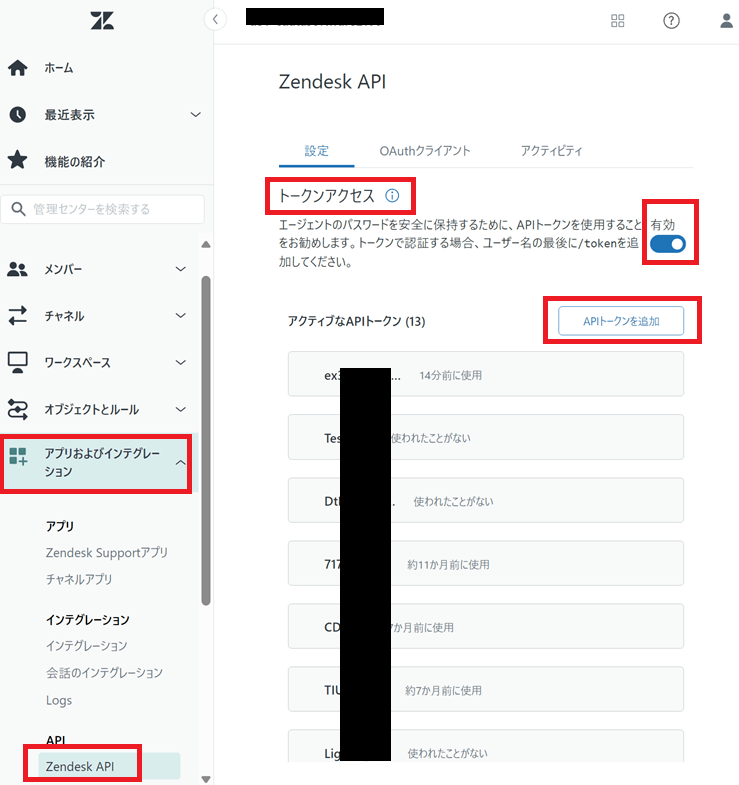 「AuthScheme=APIToken」をご利用の場合は、Zendesk 管理センターの「アプリおよびインテグレーション」→「Zendesk API」画面で「トークンアクセス」を有効にし、「API トークンを追加」していただく必要があります。