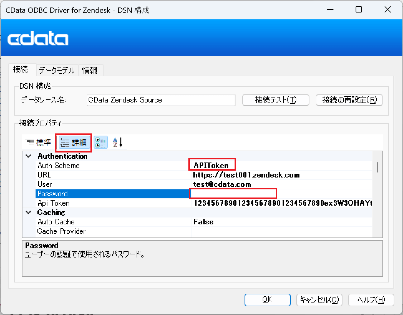 - 2024年7月31日以降:Zendesk 新規アカウントおよび、API コールにパスワード認証を使用しておらず「APIのパスワードアクセス」を手動でオンに設定していないアカウントでは、パスワード認証でのAPI コールは既に利用できなくなっているので、CData 製品からパスワードによるBasic 認証で該当アカウントに接続できません。2025年2月時点で「AuthScheme=Basic」のままで接続テストを行うと、「Couldn't authenticate you」というエラーメッセージが返されます。
