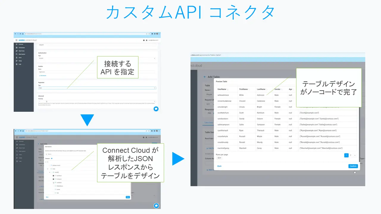 CData Connect AI がカスタムAPI のレスポンスとして返されるJSON を解析し、クリック操作のみでテーブルデザインを行うことができるので、非エンジニアのユーザーでもカスタムAPI に簡単にアクセスできます。