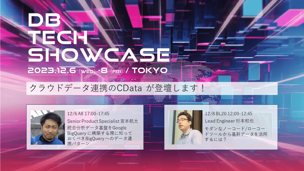 CData Software Japan 合同会社(本社:アメリカノースカロライナ州、日本オフィス:宮城県仙台市、代表社員 職務執行者:疋田 圭介、以下CData)は、2023年12月6日–12月8日に開催される国内最大規模のデータとデータベース関連のカンファレンスである『db tech showcase 2023』をスポンサーします。イベントでは、CData のプロフェッショナルがGoogle BigQuery データ連携パターンや基幹システムデータのREST API 構築をテーマに登壇します。