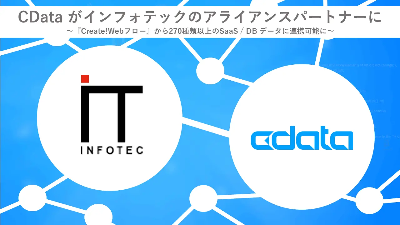 2023年10月17日、CData Software Japan 合同会社(本社:アメリカノースカロライナ州、日本オフィス:宮城県仙台市、代表社員 職務執行者:疋田 圭介)は、インフォテック株式会社(本社:東京都新宿区、代表取締役社長:山田 智次)のアライアンスパートナーとして提携を開始しました。本パートナーシップでは、インフォテックのワークフローシステム『Create!Webフロー』でCData のJDBC Drivers を使うことで、企業はCreate!WebフローからSalesforce、kintone をはじめとする270種類以上のSaaS / DB にシームレスにアクセスできるようになります。ノーコードでクラウドデータにアクセスが可能になることで、ワークフロー利用シーンが格段に広がり、ユーザーのデータ活用を下支えします。