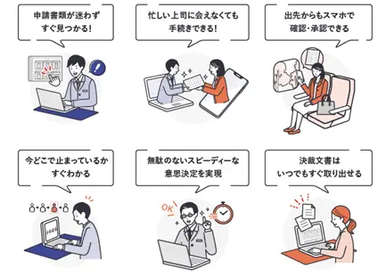 昨今では、デジタルシフトに取り組む企業様より、押印をともなう紙の申請書・稟議書のデジタル化やWeb で承認業務を完結する目的で導入いただくことが増えてきました。お客様からは「自宅や外出先などからも利用できるため、書類の提出や押印のために出社する必要がなくなった」「自動化によって業務効率が上がり、作業時間を大幅に短縮できるようになった」とのお声をいただいております。