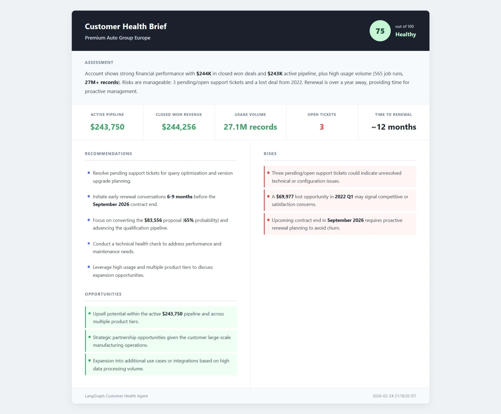 - Analyst ノードが単一の LLM 呼び出しで構造化された JSON ヘルスアセスメント(スコア、シグナル、推奨事項、リスク)を生成