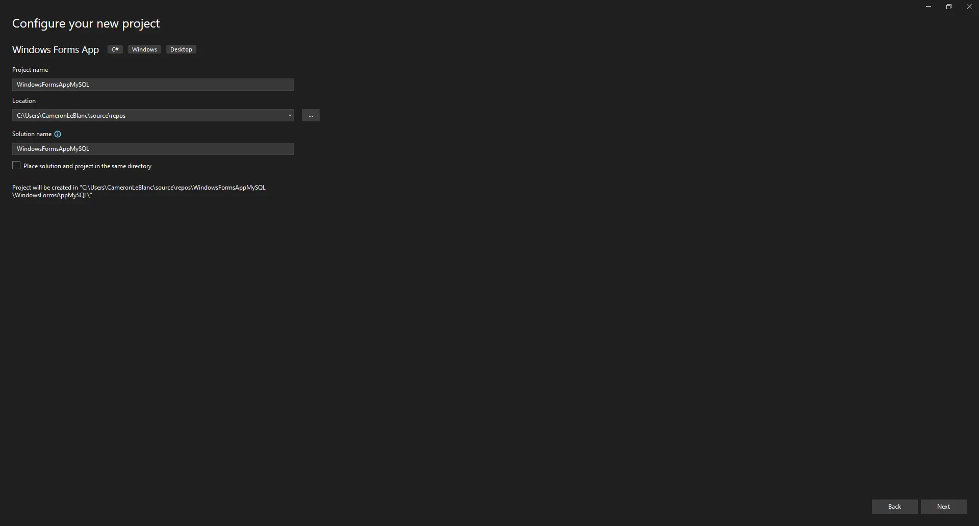 プロジェクト名を「WindowsFormsAppMySQL」に設定します。このウォークスルーからコードをコピー&ペーストする場合、名前空間が一致するようにこの名前を使用してください。設定後、「作成」を選択します。
