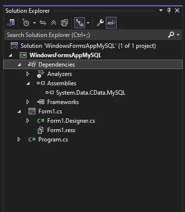 - インストールディレクトリ内の lib サブフォルダにある System.Data.CData.MySQL.dll への参照を追加します(例:「C:\Program Files\CData\CData ADO.NET Provider for MySQL 2024\lib」)。