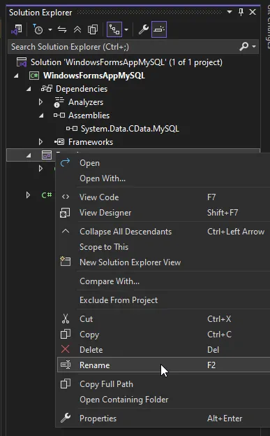 ソリューションエクスプローラーで Form1.cs を右クリックし、名前の変更 を選択して ConnectForm.cs に変更します。