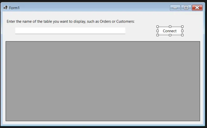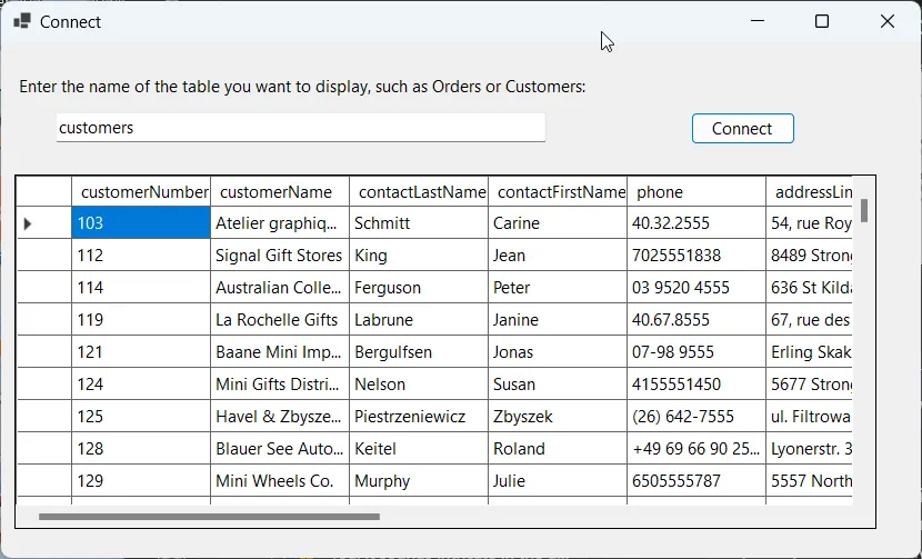 すべての設定が完了したら、選択した MySQL テーブルからデータを読み込んで表示するアプリケーションを実行できます。まずソリューションをビルドし、緑色の再生ボタンをクリックしてアプリケーションを起動します。アプリケーションが開いたら、以下のようにテーブル名を入力してデータを表示できます: