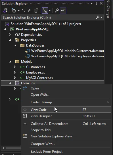 • DataGridView で表示される顧客を読み込むために使用される MySQLContext のインスタンスを作成します。