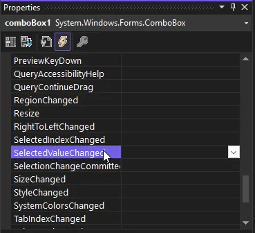 2. ComboBox のプロパティで、イベント(稲妻ボタン)を選択し、SelectedValueChanged イベントをダブルクリックします。これにより、従業員の選択が変更されるたびに発生するイベントのスタブがフォームのコードに作成されます。