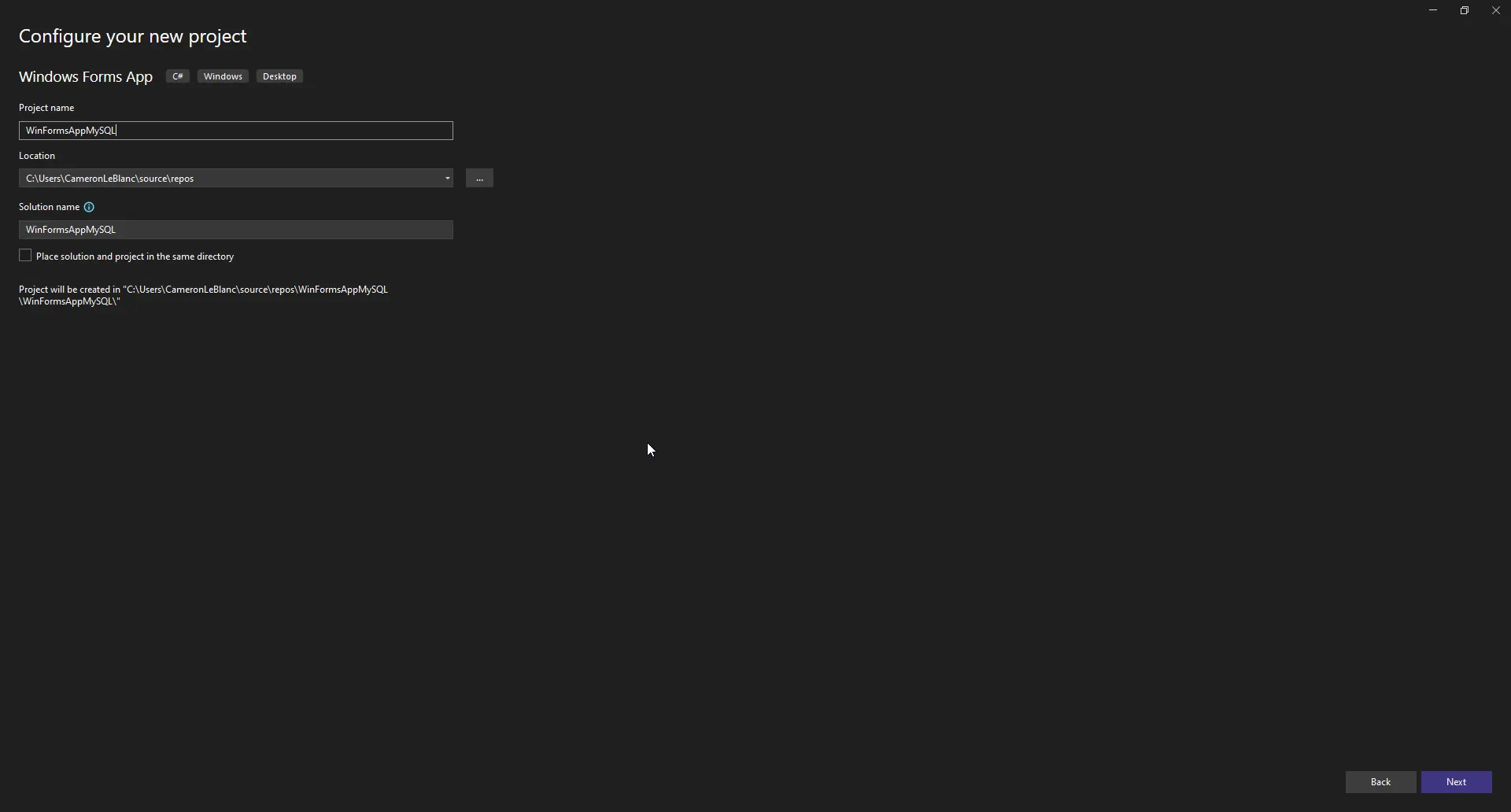 2. プロジェクト名を「WinFormsAppMySQL」に設定します。このガイドのコードをコピー&ペーストした際に名前空間が一致するようにするためです。設定したら「次へ」を選択します。