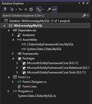 4. 付属のライセンスファイル(.lic)をプロジェクトに追加します。これは、ソリューションエクスプローラーでプロジェクトを右クリックし、追加 -> 既存の項目 -> System.Data.CData.MySQL.lic(インストールディレクトリの lib -> netstandard2.0 サブフォルダーにあります)に移動して追加できます。最後に、ライセンスファイルを右クリックし、出力ディレクトリにコピープロパティを新しい場合はコピーするに設定します。