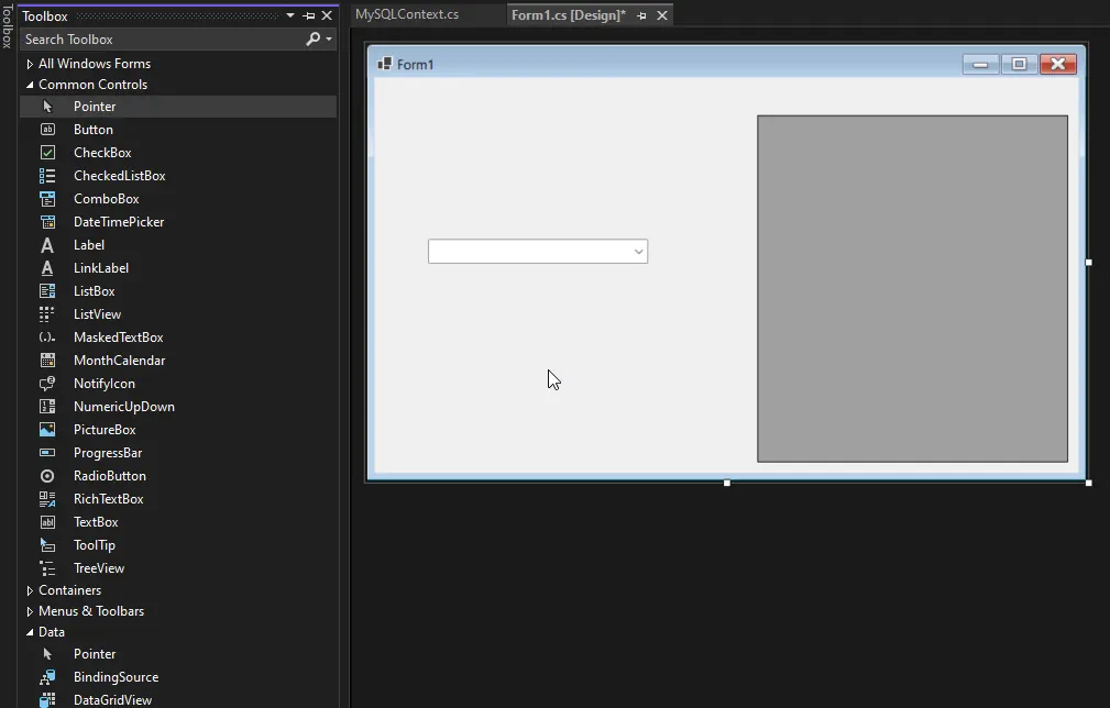 フォームデザイナーを開き、サーバーエクスプローラーの左側にある「ツールボックス」から DataGridView と ComboBox をフォームに追加します。