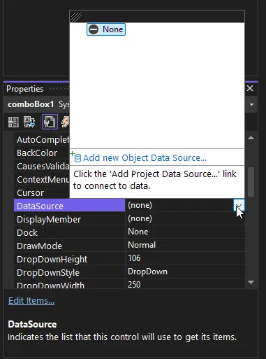 1. 追加した ComboBox を選択してプロパティを開きます。「DataSource」プロパティを選択し、右側のドロップダウンをクリックして、下部にある「新しいオブジェクトデータソースの追加...」を選択します。