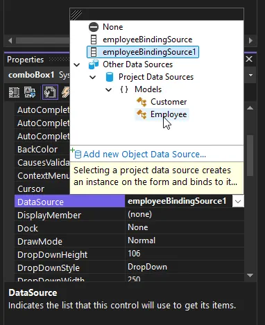3. これで「DataSource」プロパティのドロップダウンに、作成したオブジェクトデータソースが表示されます。「その他のデータソース」を展開し、「プロジェクトデータソース」を展開して、Employee を選択します。