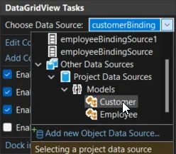 1. 追加した DataGridView の右上隅にある小さなボタンを選択し、「データソースの選択」のドロップダウンを開き、「その他のデータソース」、「プロジェクトデータソース」を展開して、Customer を選択します。