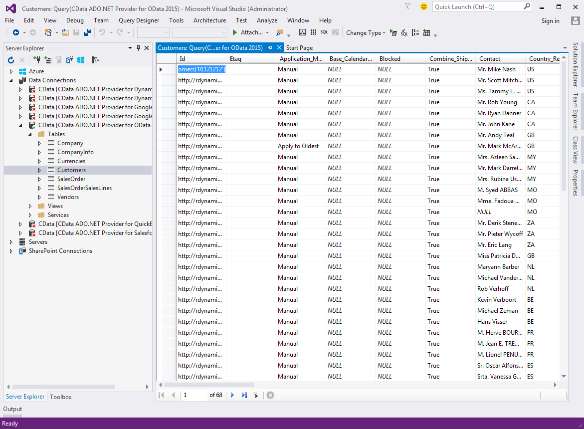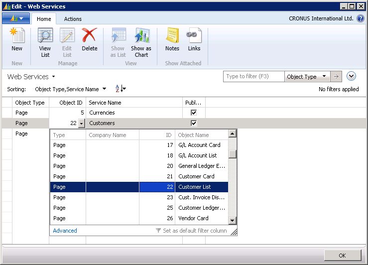 たとえば、顧客の一覧を取得するには、Object Id が 22 のページを公開するように設定します。 Service Name は、CData プロバイダーで Dynamics NAV からデータを取得する際にテーブル名として表示されます。これで、OData 経由で Dynamics NAV に接続できるようになります。