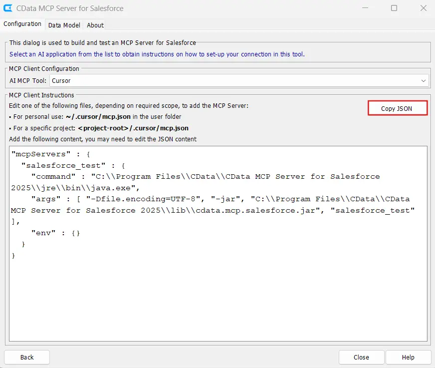 - CData Code Assist MCP for Salesforce を起動して、設定ダイアログを開きます。