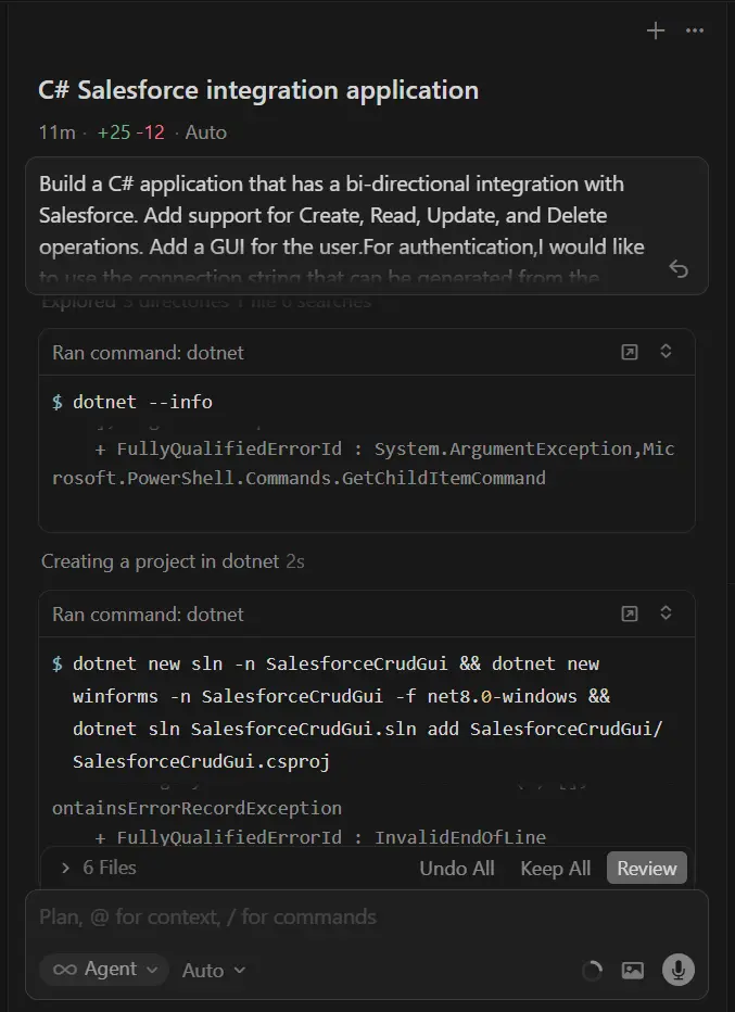 MCP 接続が確認できたら、Cursor は Salesforce のスキーマ情報を活用して、適切なフィールド名、データ型、リレーションシップを使ったオブジェクト操作が可能な正確な C# コードを生成できるようになります。
