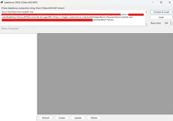 - 設定セクションに CData Salesforce Driver の接続文字列を入力します。アプリケーションが接続を確立し、資格情報を検証します。