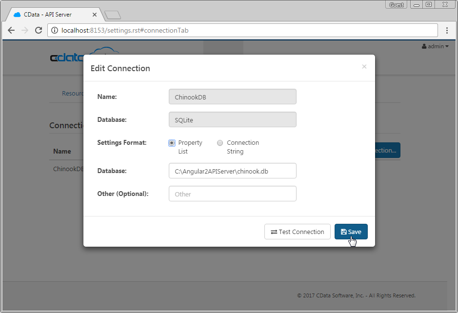 まだインストールしていない場合は、CData API Server をダウンロードする必要があります。API Server をインストールしたら、アプリケーションを起動し、データへの接続を設定します(この記事では、付属のサンプルデータベースを使用します)。そして、SPA でアクセスしたいテーブル用の REST API を作成するように設定します。