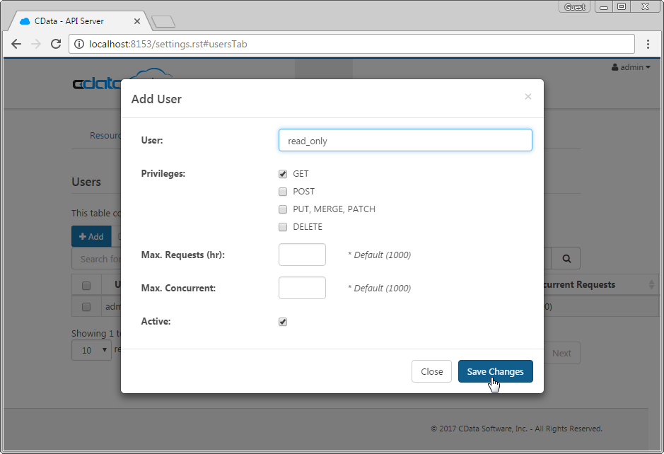 次に、API Server を通じてデータベースデータにアクセスするためのユーザーを作成します。SETTINGS ページの Users タブでユーザーを追加・設定できます。ここでは、データを表示するだけのシンプルな SPA を作成するため、読み取り専用アクセスを持つユーザーを作成します。 Add をクリックし、ユーザー名を入力し、Privileges で GET を選択して、Save Changes をクリックします。