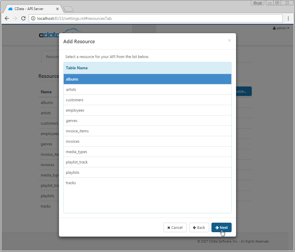 ユーザーを作成したら、データベーステーブルへのアクセスを有効にする準備が整いました。テーブルを有効にするには、SETTINGS ページの Resources タブで Add Resources ボタンをクリックします。アクセスしたいデータ接続を選択し、 Next をクリックします。接続を選択したら、テーブル名をクリックして Next をクリックすることでリソースの有効化を開始できます。リソースは一度に1つのテーブルずつ追加する必要があります。この例では、すべてのテーブルを有効にしました。