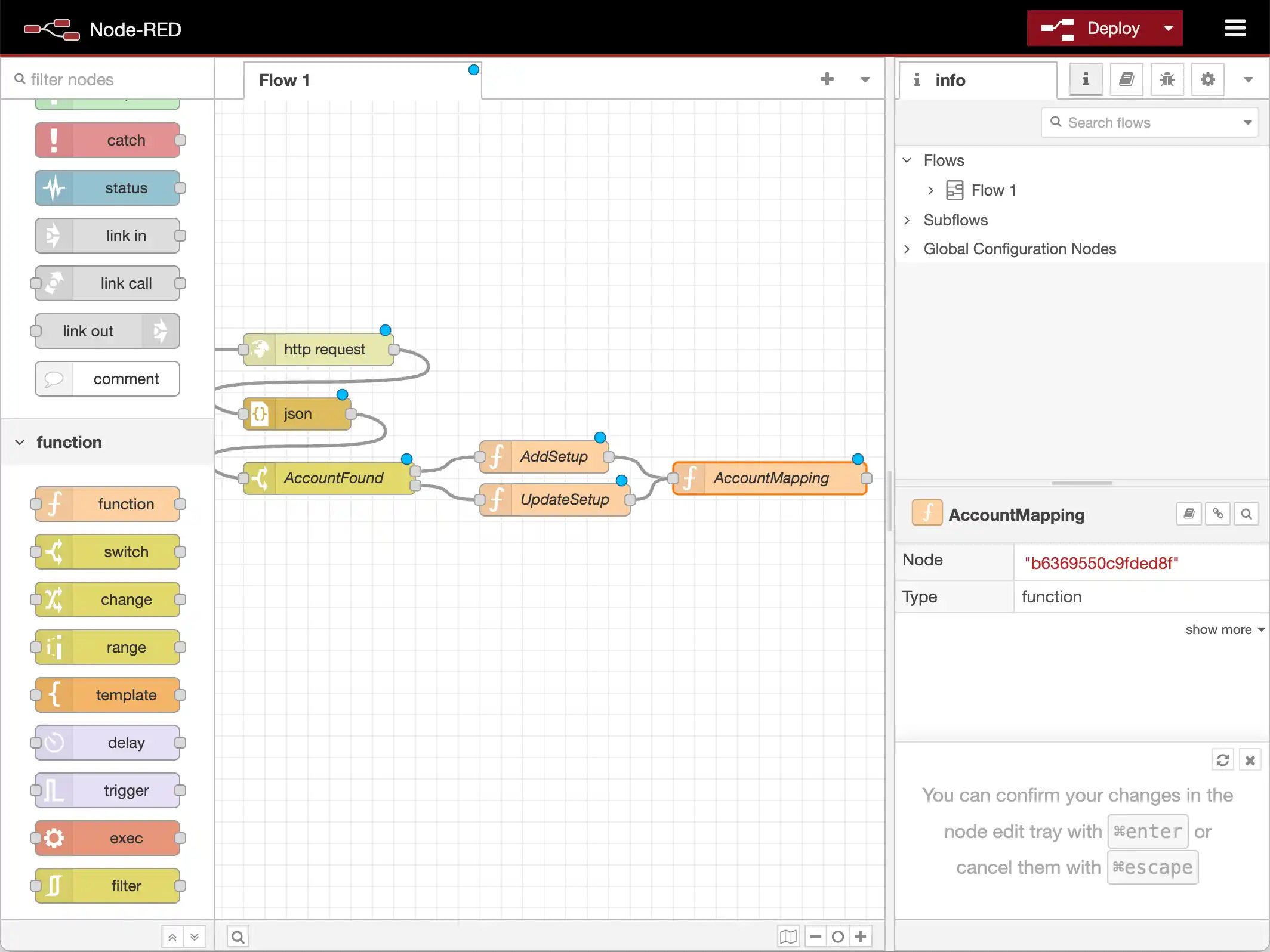 2番目の function ノード(UpdateSetup)は、既存のヘッダーをクリアし、既存のアカウントの ID を保存し、追加フラグを false に設定します。以下の JavaScript を function にコピーします: