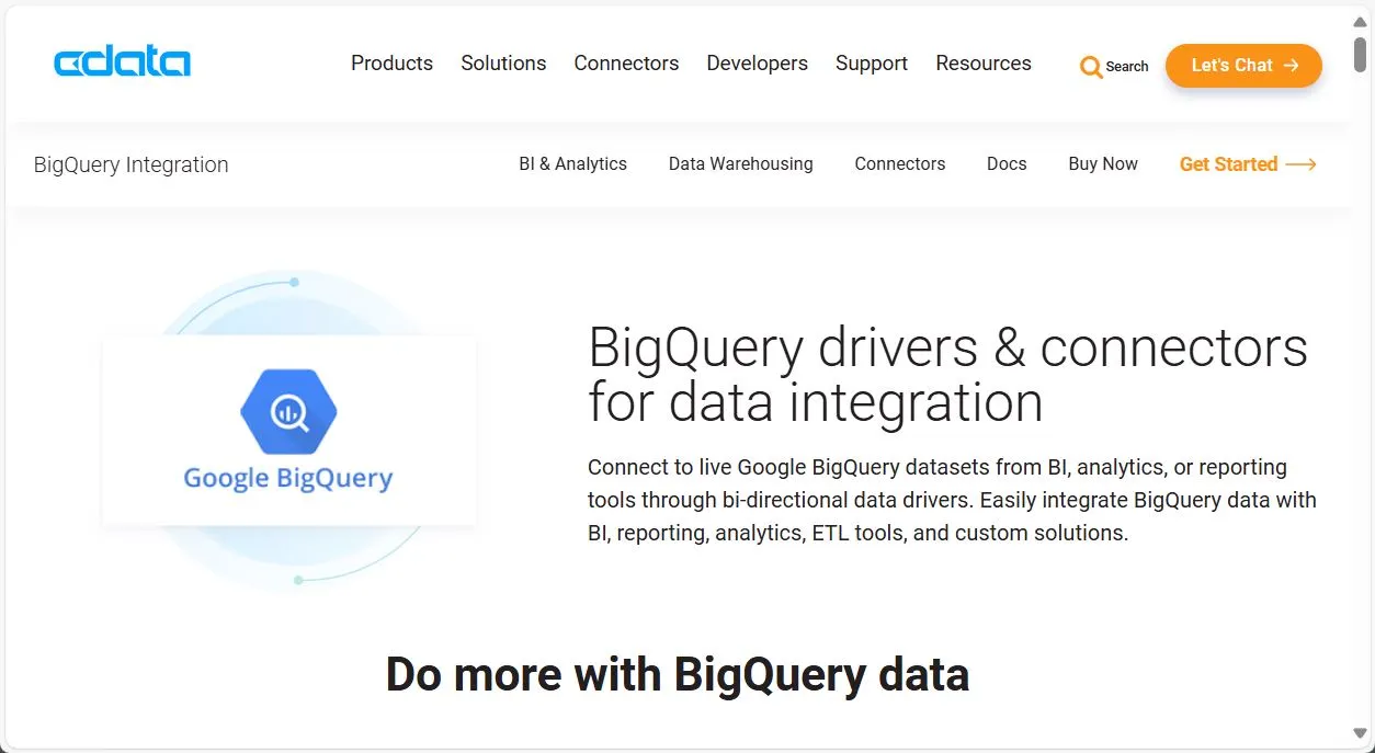 CData は、JDBC、ODBC、ADO.NET、Excel 向けの強力な BigQuery ドライバーを提供しており、Google BigQuery へのシームレスな接続を実現します。BI、分析、ETL ワークフロー、カスタムアプリケーションとの間で、ライブ BigQuery データを簡単に統合できます。