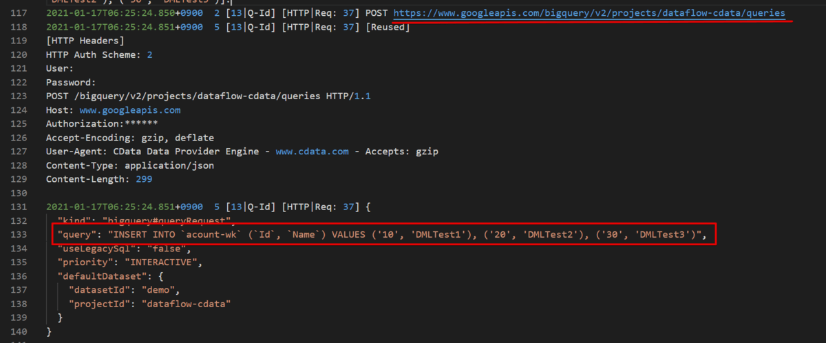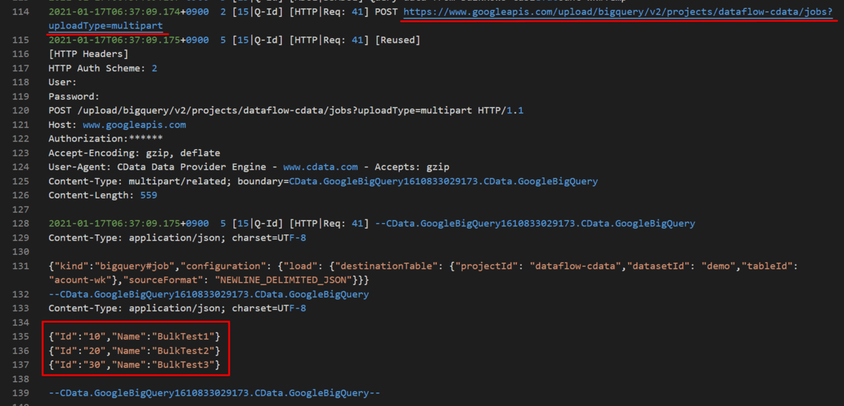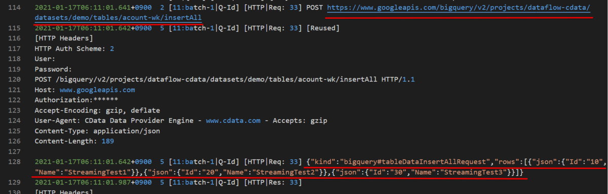 ドライバーが insertAll API メソッドを呼び出し、リクエストボディにレコードを JSON として送信していることがわかります。