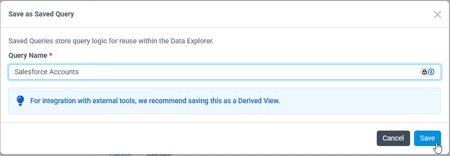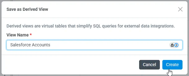 Query Builder または SQL Editor でクエリを作成します。クエリを実行すると、Save ボタンが表示されます。Save > Save as Derived View をクリックすると、Create Derived View ダイアログが表示されます。