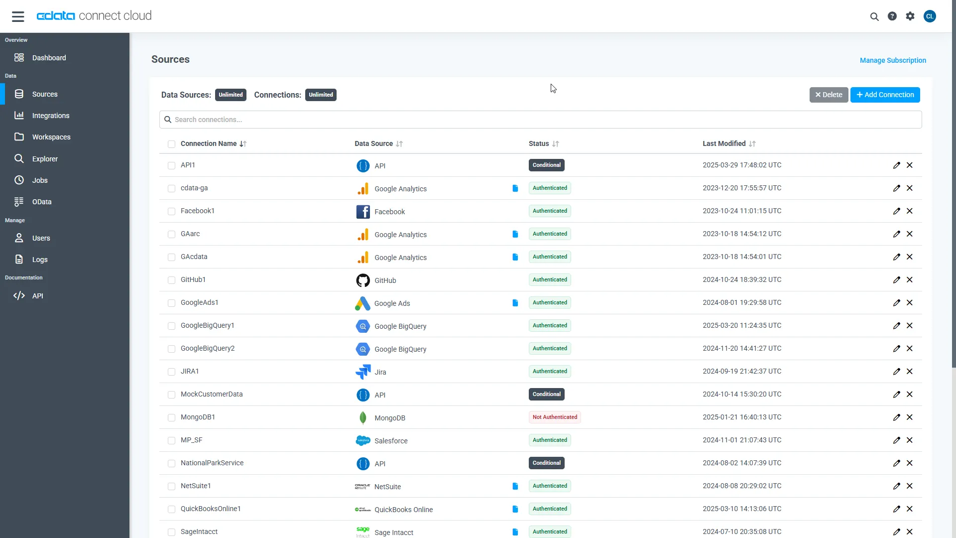 CData Connect AI は、一貫性のある標準準拠のインターフェースを通じて、アプリケーションを広範なリアルタイムデータソースに接続する統合接続プラットフォームです。CData Connect AI は、あらゆるシステムからシームレスにデータにアクセスするためのツールを提供します。 CData Connect AI の主な機能には、幅広いデータ接続、リアルタイムデータアクセス、CRUD サポート、セキュアなアクセス、包括的なデータモデリングと動的ディスカバリーがあります。