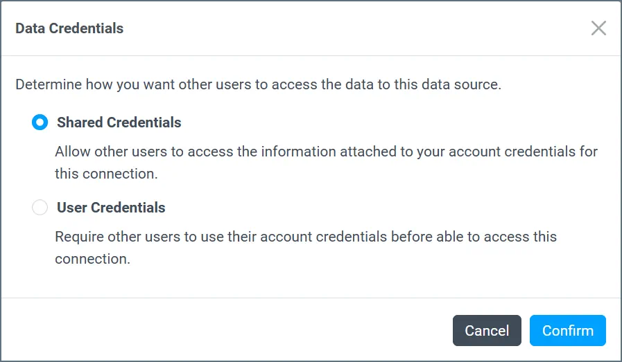 データソースがユーザー資格情報をサポートしている場合、接続設定の認証セクションに Data Credentials ラベルが表示されます。このラベルの横にある設定をクリックすると、接続の目的のモードを設定できるダイアログが開きます。